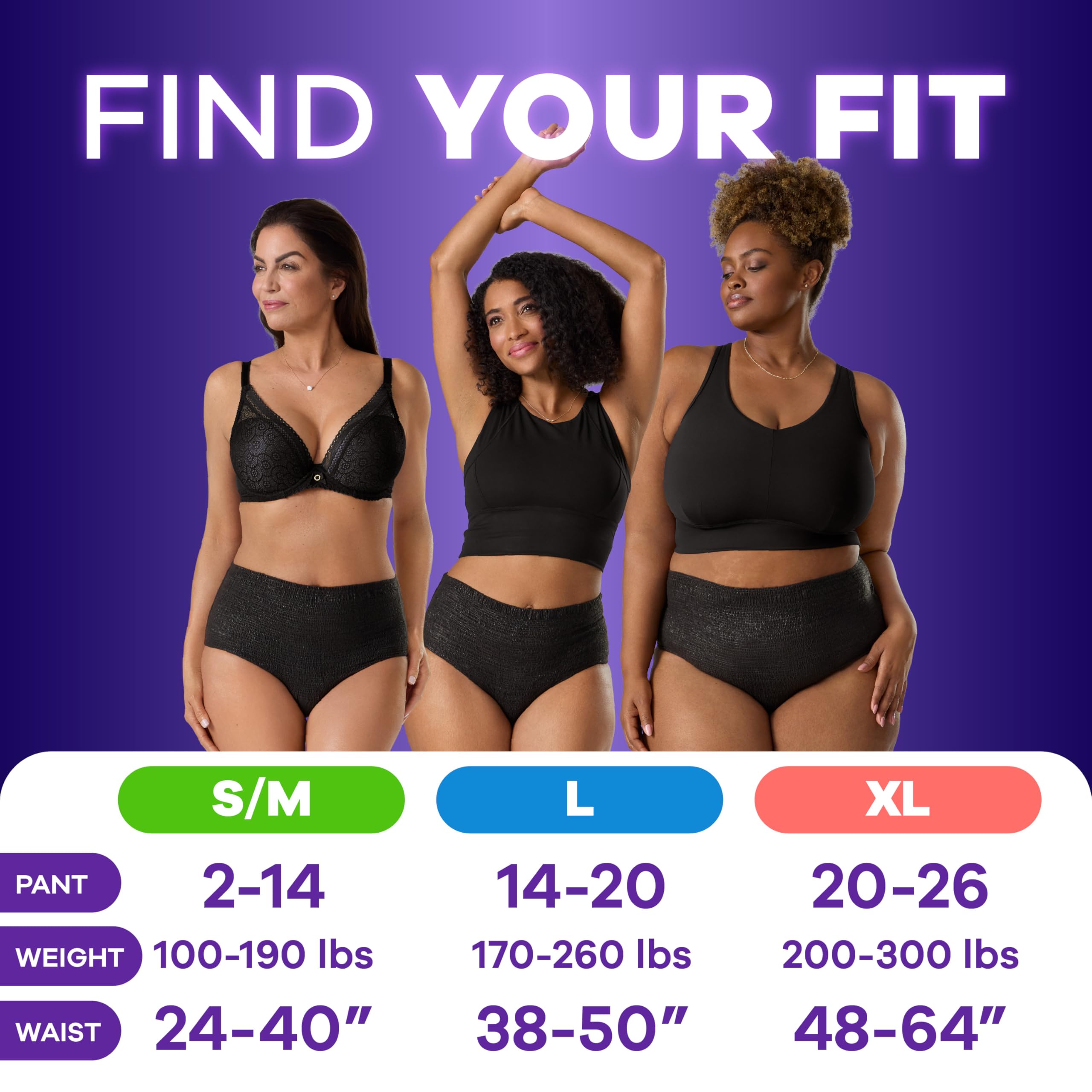 DESIGNED TO FIT ALL KINDS OF CURVES from dress/pant sizes 2-26W+. Find your fit on the Always Discreet My Fit size chart