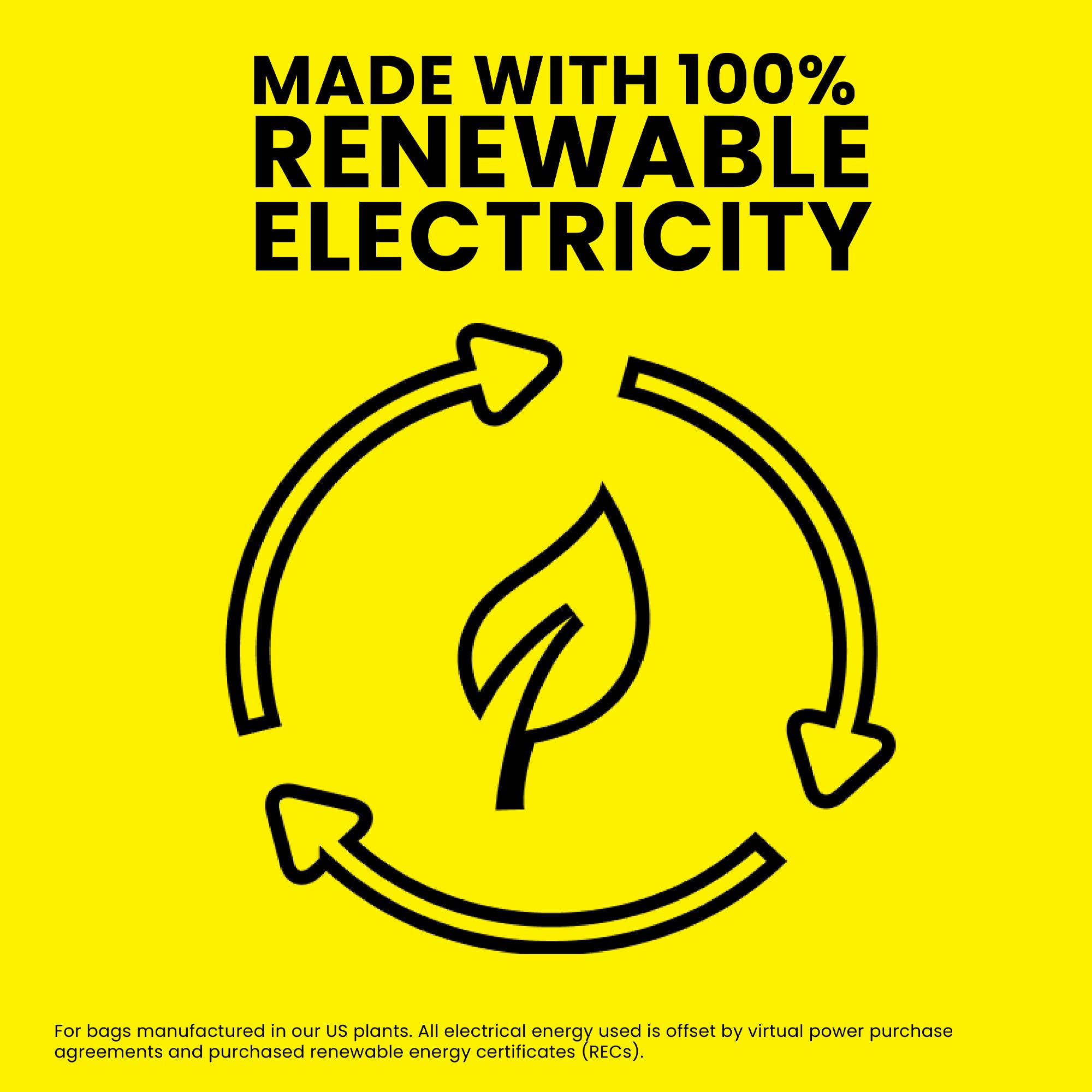 MADE WITH 100% RENEWABLE ELECTRICITY*: For bags manufactured in our US plants, all electrical energy used is offset by virtual power purchase agreements and purchased renewable energy certificates