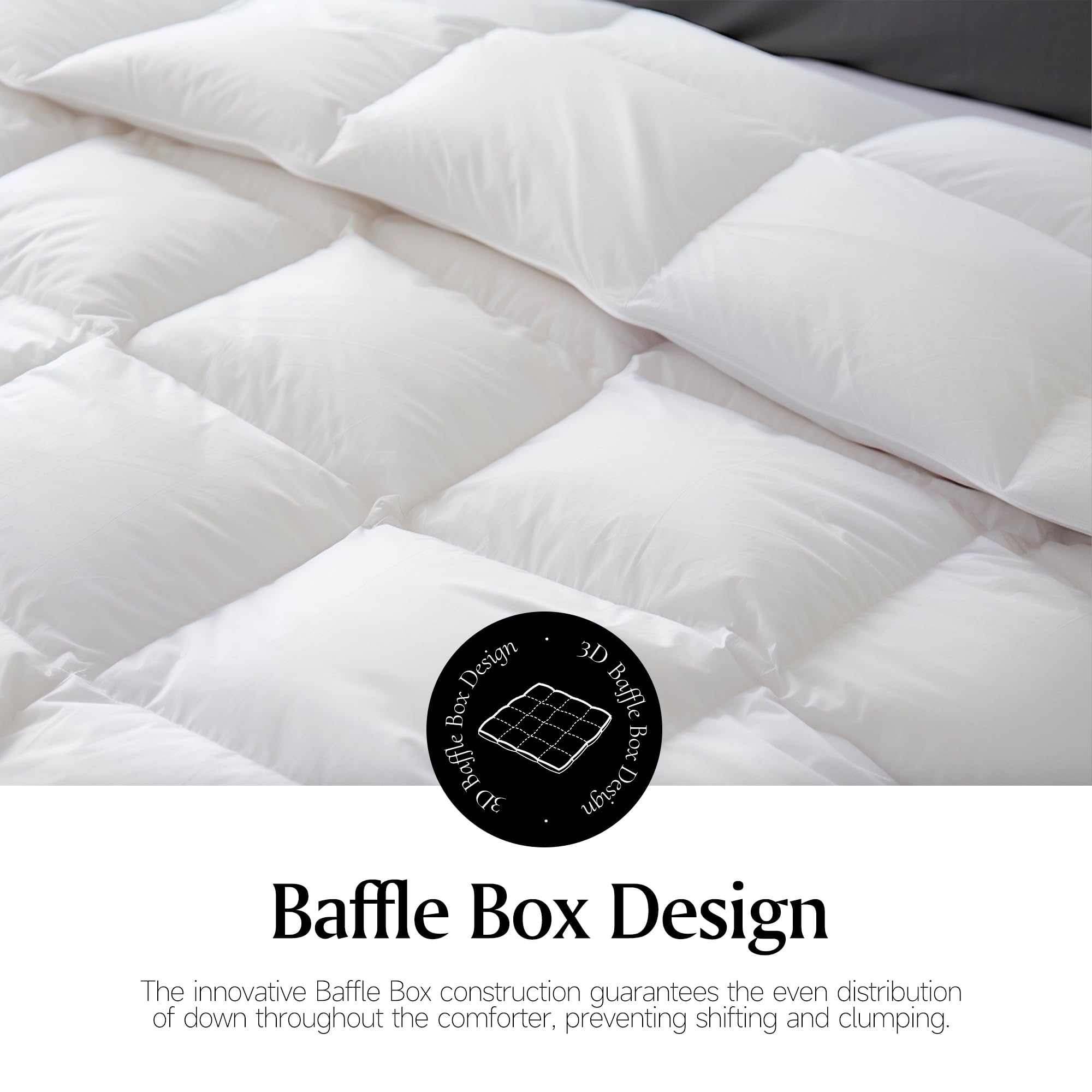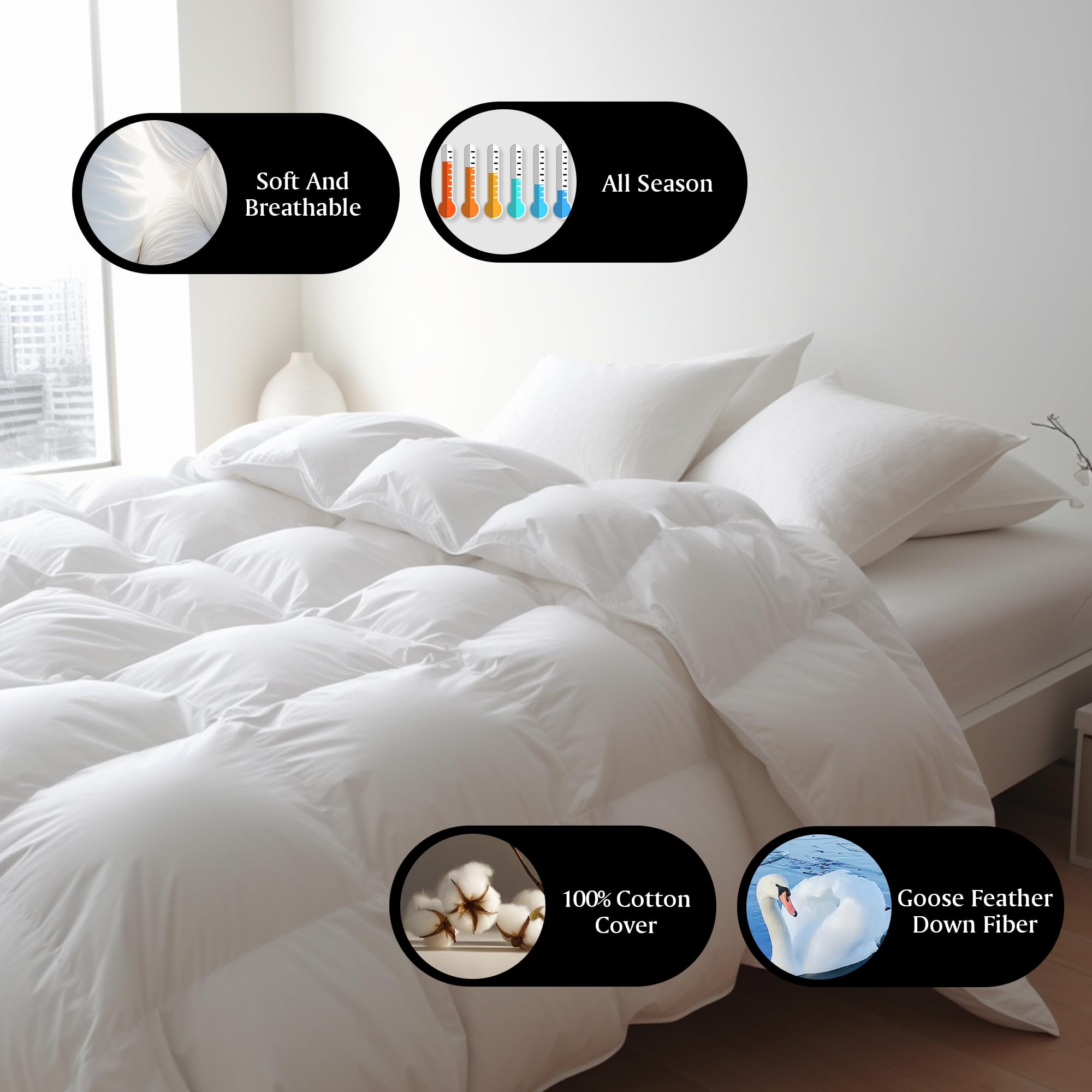 【Soft & Fluffy for Ultimate Comfort】 – Filled with a blend of 90% white goose feather fiber and 10% white goose down fiber, this comforter offers luxurious softness and bulkiness. The sewn-through box construction ensures an even distribution of fill, providing exceptional warmth without the weight. It absorbs sweat to cool you down while trapping body heat for cozy warmth.
