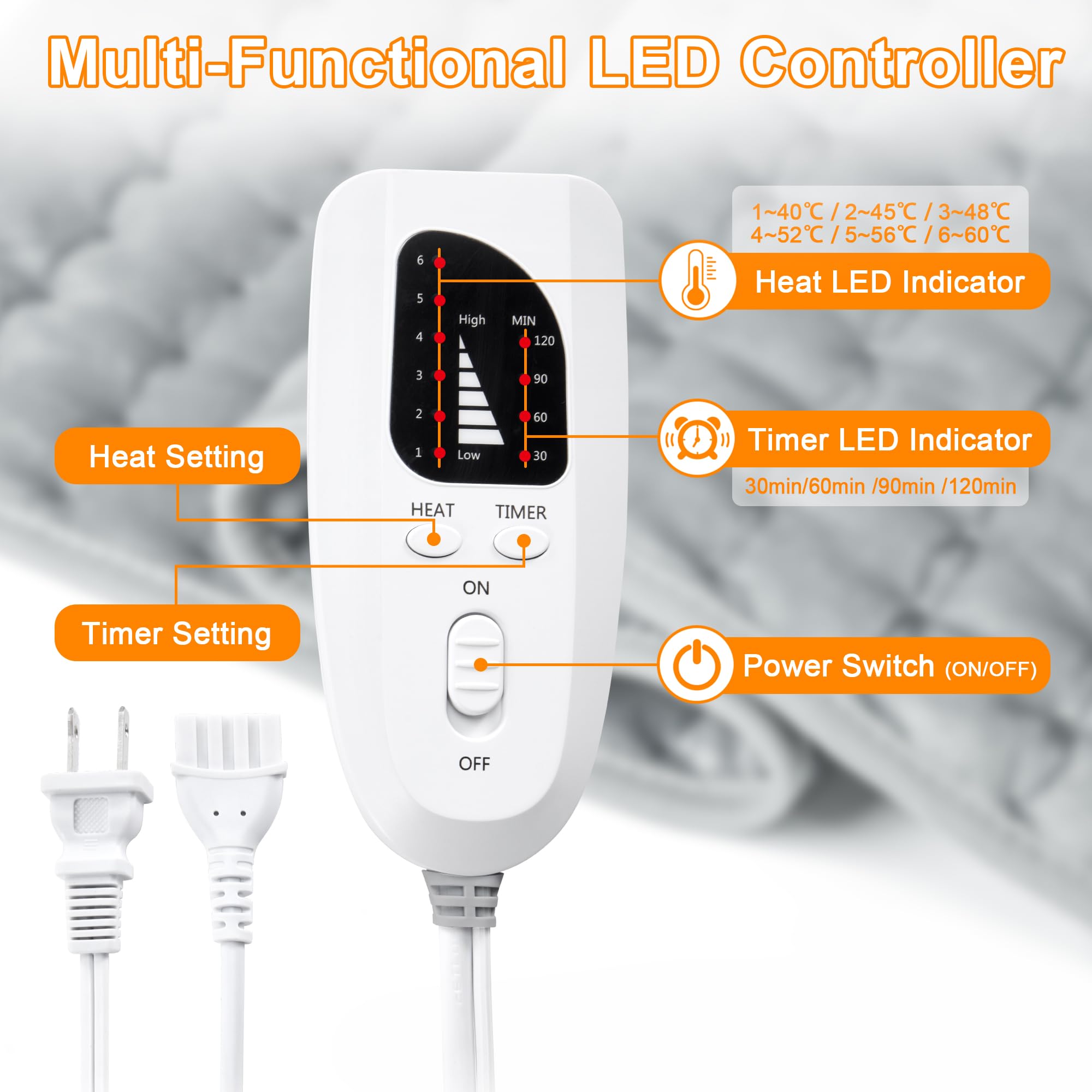 Heating pad has 6 temperature settings,you can control the temperature of this electric heating pad via the controller,it heats up quickly in a short period of time so that you can enjoy the warmth faster