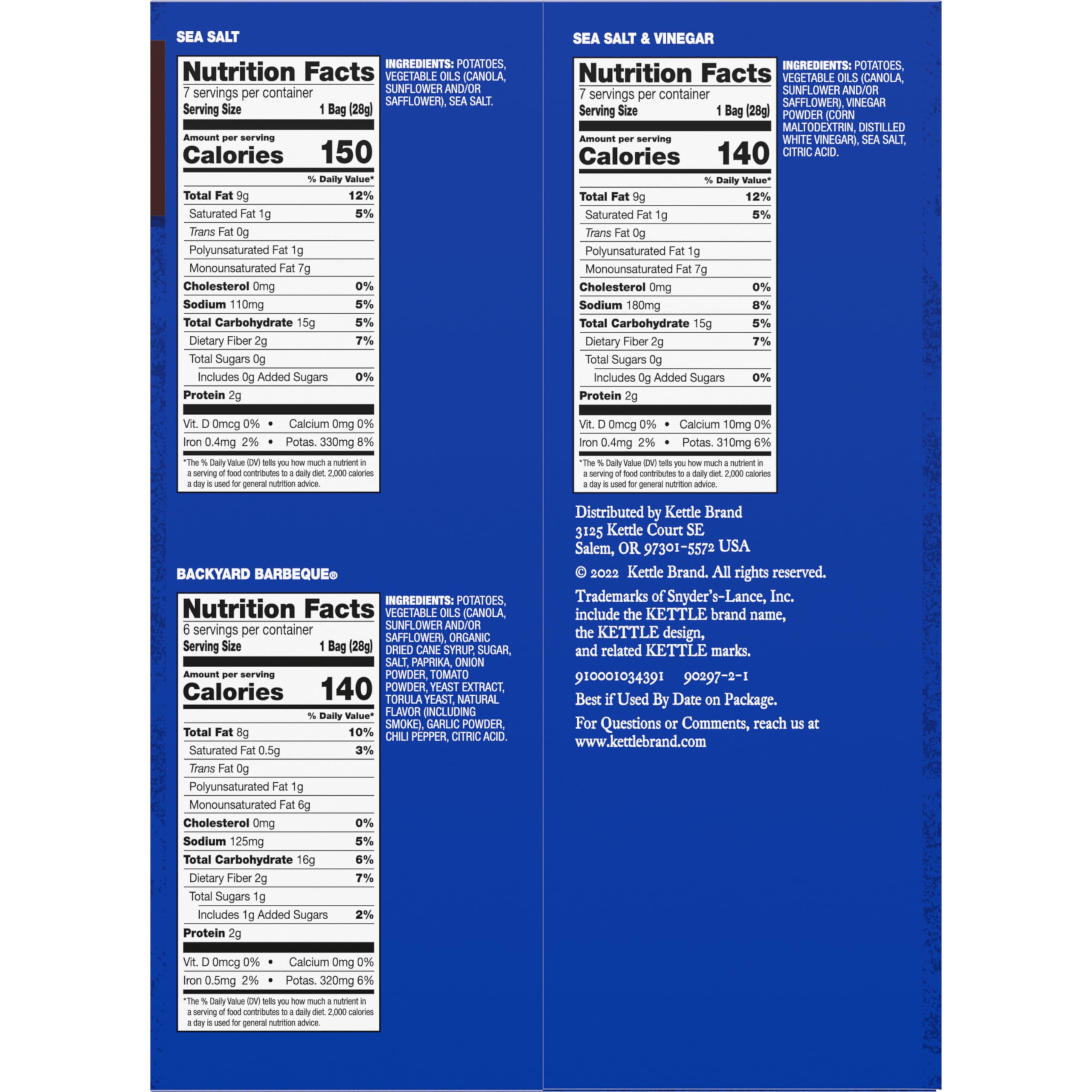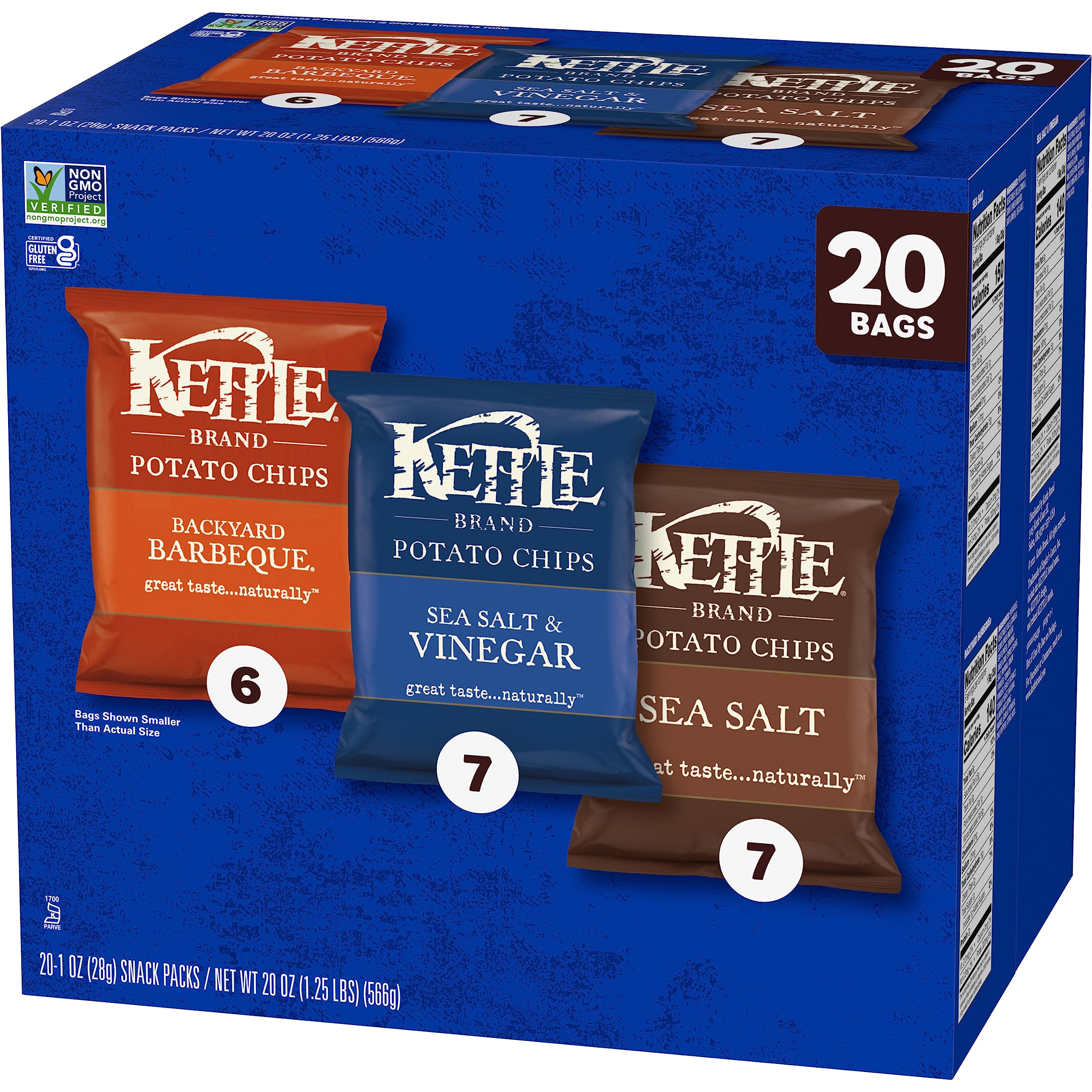 Grab a variety pack of individual-sized bags of your favorite Kettle Brand potato chip flavors: Sea Salt, Sea Salt & Vinegar, and Backyard Barbeque. The variety pack of 20 is the perfect solution for parties, family, or for when you want a little variety in your snack. Kettle Brand searches high and low for undisputed potato excellence. Determined not to disrupt flawless, spudsy goodness, these beauties are cooked, skins on, one batch at a time until golden. Everyone loves the flavor and crunch of these selections, whether with tasty seasoning or just a kiss of salt. Kettle Brand potato chips are delicious because they’re made from authentic recipes. The tangy vinegar, smoky BBQ, and all-around perfect sea salt all bring major potato flavor. It takes pretty high standards to achieve the amazing crunch and flavor of Kettle Brand chips – quality ingredients make a difference. Get ready for great taste and open a bag of undeniably flavorful Kettle Brand potato chips.