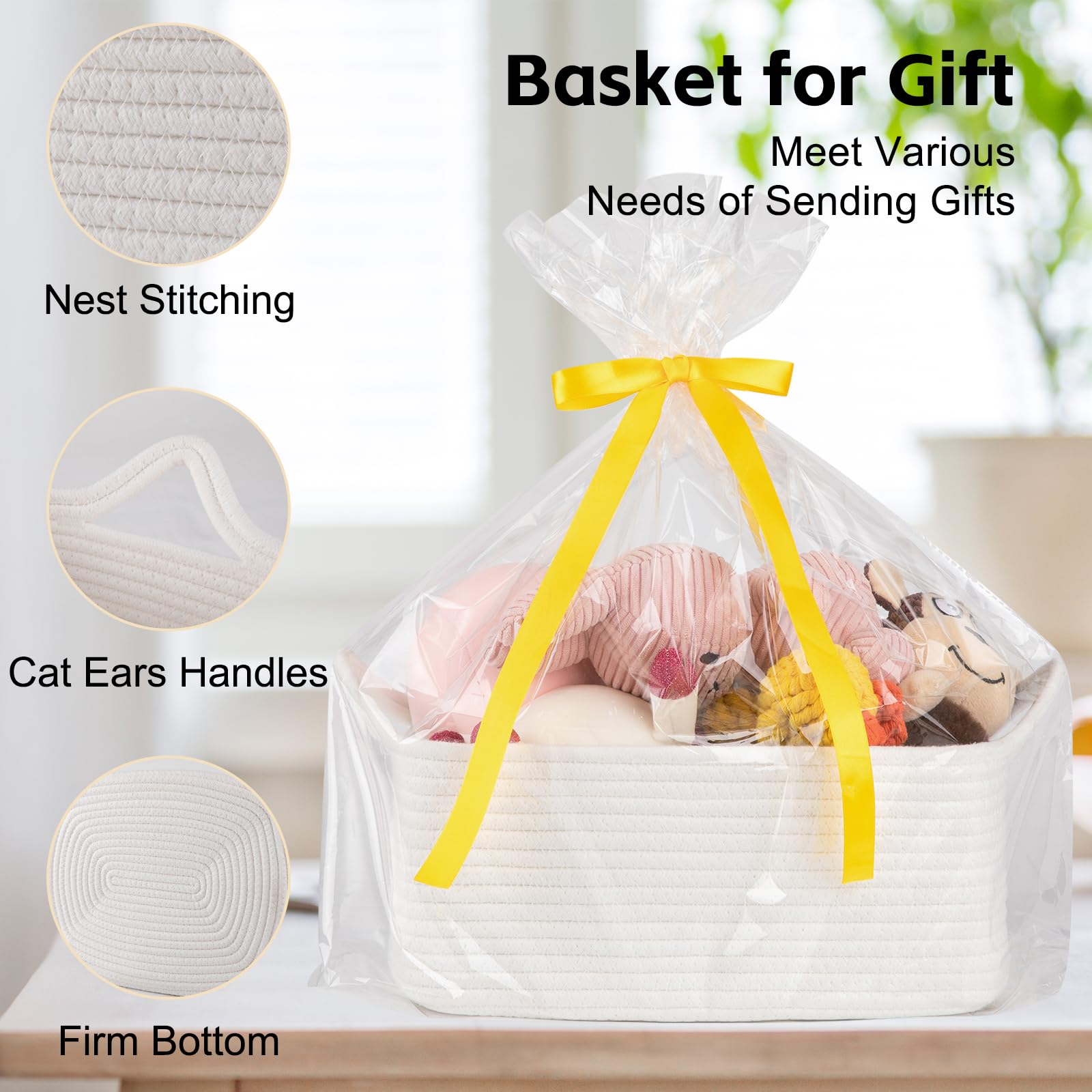 Woven Basket, Gift Basket Empty with Gift Bags and Ribbons, Rope Baskets for Baby Showers,Halloween, Storage Baskets with Handles for Nursery, Pet Toy Organizer – White