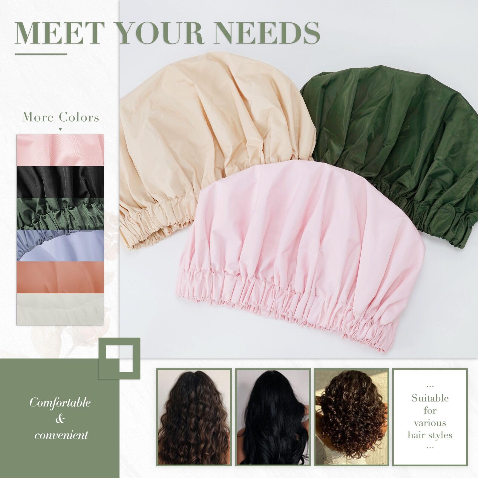 【Versatile Application】Our reusable shower caps can be used for showering, cooking, household cleaning, and spa sessions, keeping your hair dry and protecting it from dust and cooking fumes. This bath hair hat also fit for makeup, face washing, and applying facial mask, due to it suitable for all hair types-long, curly, voluminous or short, adding more convenience and beauty to your daily life.