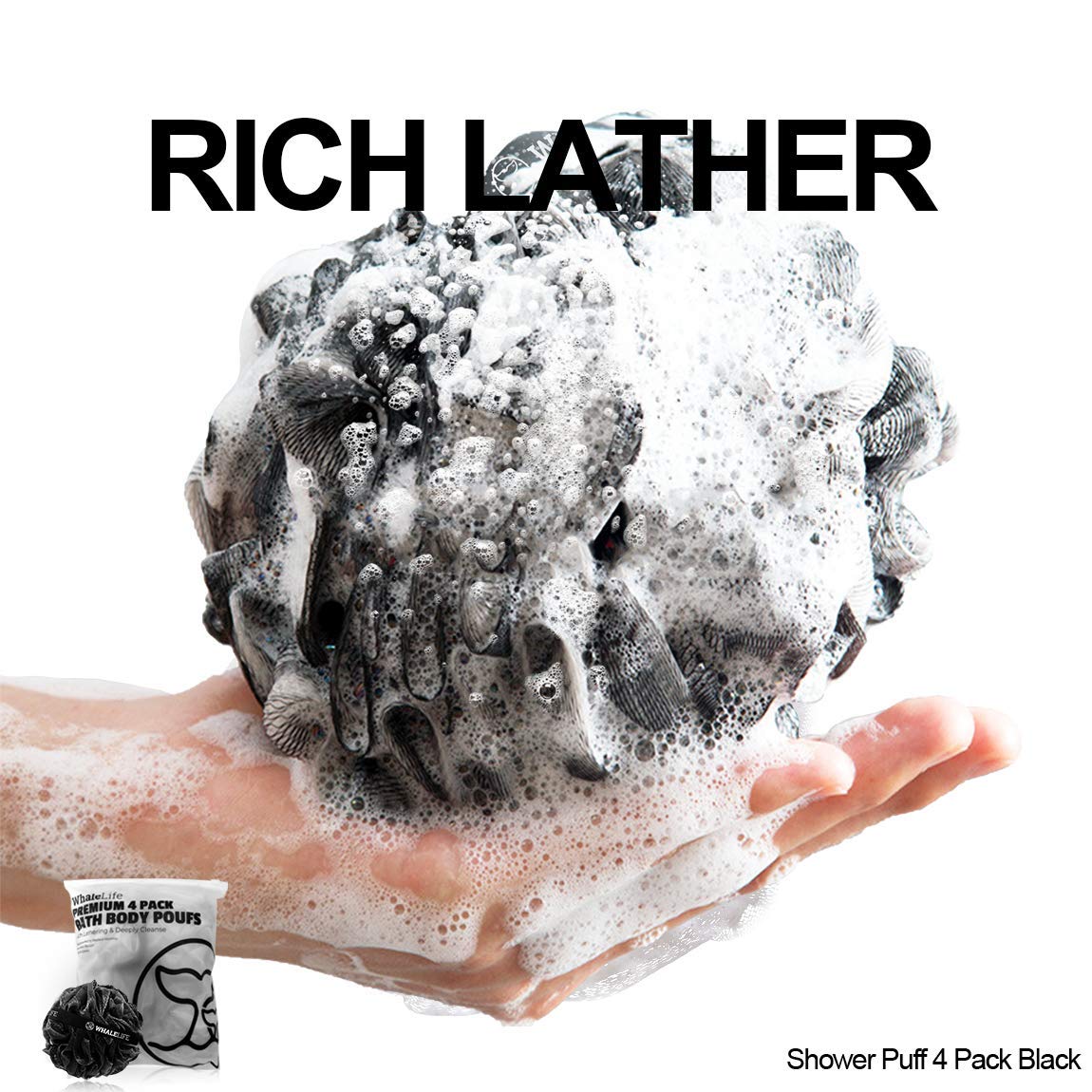 Shower Puff 4 Pack Black Bath Sponge Shower Loofahs Pouf Ball Nature Bamboo Charcoal Mesh Bulk Puffs Large, Shower Essential Skin Care by WhaleLife