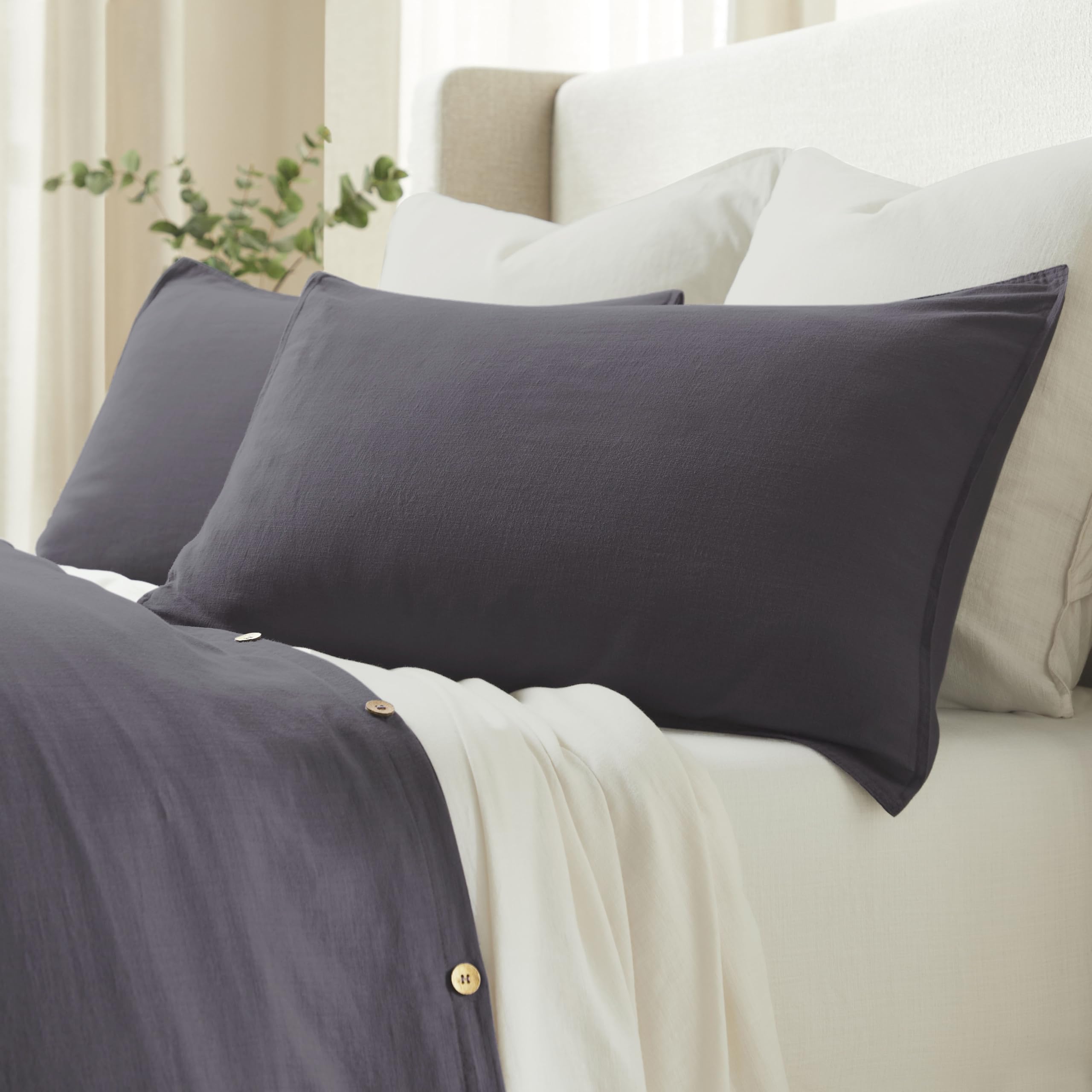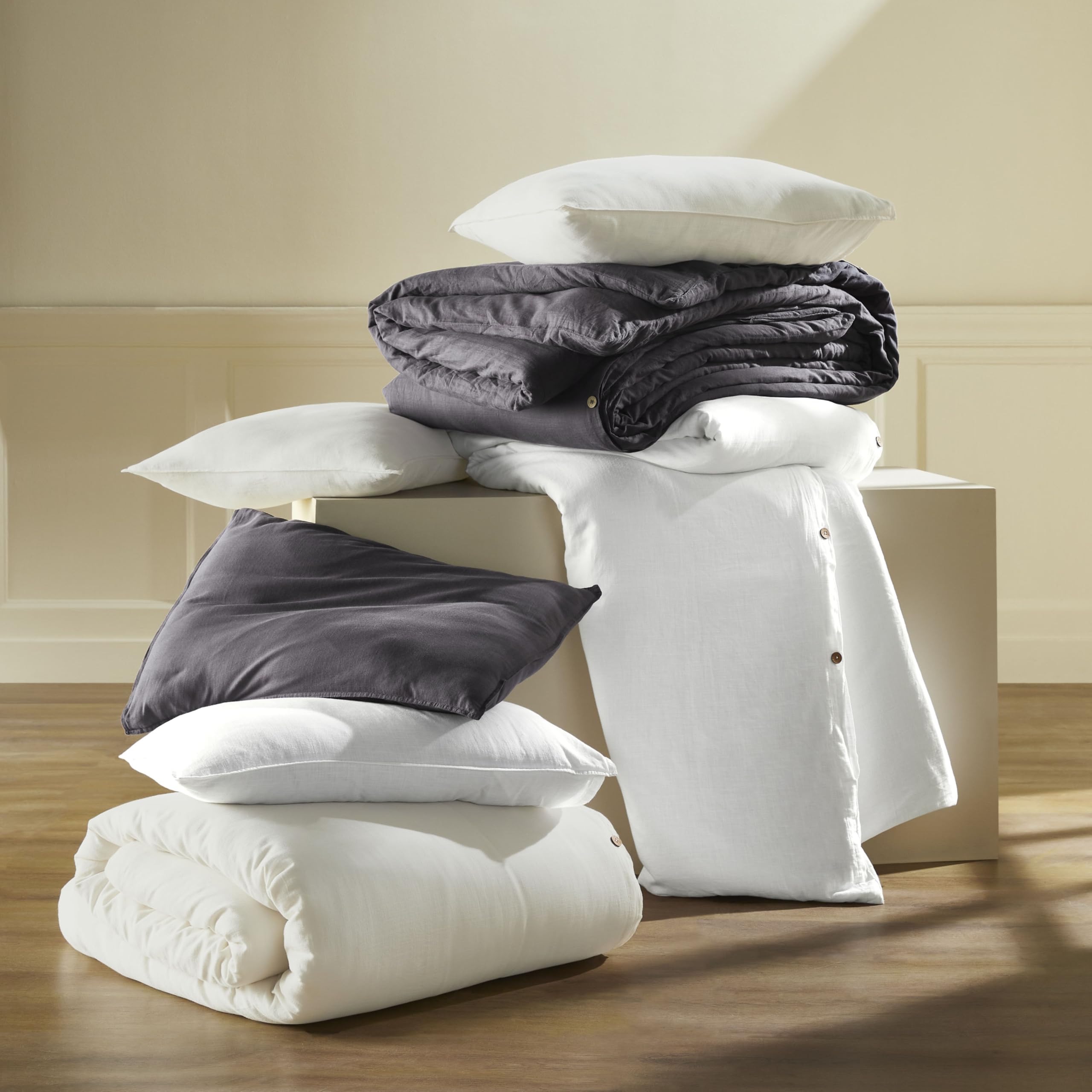 The Superior Chloe Duvet Cover Set blends form and function with breathable, garment-washed percale cotton for a relaxed, linen look. Pre-shrunk for softness, it features four corner ties, envelope shams, and coconut shell buttons for a clean, natural finish. Double-needle stitching adds polish, making it a serene, well-made staple for your bed.